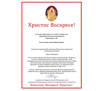 «Многоуважаемый Антон Викторович, Атаманы, дорогие Старики, братья казаки, сестры казачки, кадеты! Поздравляю вас с праздником возрождения Черноморского казачьего войска, — сказал войсковой священник в своем видеопоздравление. — Шесть лет назад казаки Крыма и Севастополя объединились в единое Черноморское казачье войско».