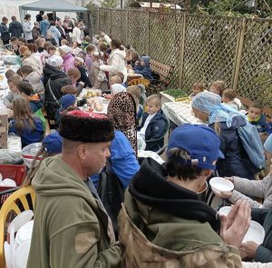 По окончании богослужения прихожане, юные следопыты и гости были приглашены к трапезе, где их ждала традиционная казачья кухня: борщ, гречневая каша с мясной поджаркой, салат «Летний» и узвар. Угощением отведали около 250 человек.