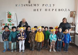 Сначала малыши рассматривали стенды в холле, классный руководитель казачьего 2- Б класса Дмитриева И.В. рассказала об изображенных на них людях, предметах быта и праздниках.