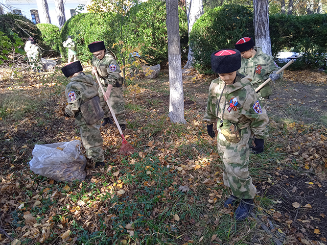 Кадетам определили территорию парка для уборки осенней листвы, которая к концу октября ярким ковром укрыла землю. Бойцы активно работали граблями, собирали листья в мешки. И до обеда, и после — до ужина — кипела работа. День закончился участием в Богослужении, где кадеты исповедались, подготовив себя к Причастию. Кроме того, они вместе с сестрами монастыря прошли Крестным ходом по монастырской территории.