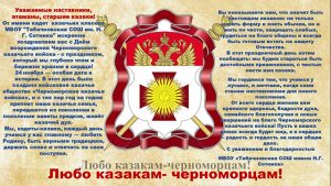 Казак — это православный воин, защитник Родины. Во все времена казаки стояли на страже государственных границ и Православной веры. В настоящее время, казачество является одной из ведущих патриотических сил нашей страны. Защита Отечества является наиважнейшей задачей казака, и черноморцы это не раз доказали своими делами и поступками.