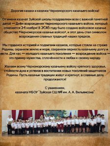 Учащиеся кадетских казачьих классов общеобразовательных школ Республики Крым вместе с педагогами и казаками-наставниками, казачья молодежь и творческие коллективы Крыма и Севастополя подготовили нашим черноморцам свои поздравления с искренними пожеланиями с 7-й годовщиной возрождения Черноморского казачьего, создания войскового казачьего общества «Черноморское казачье войско».