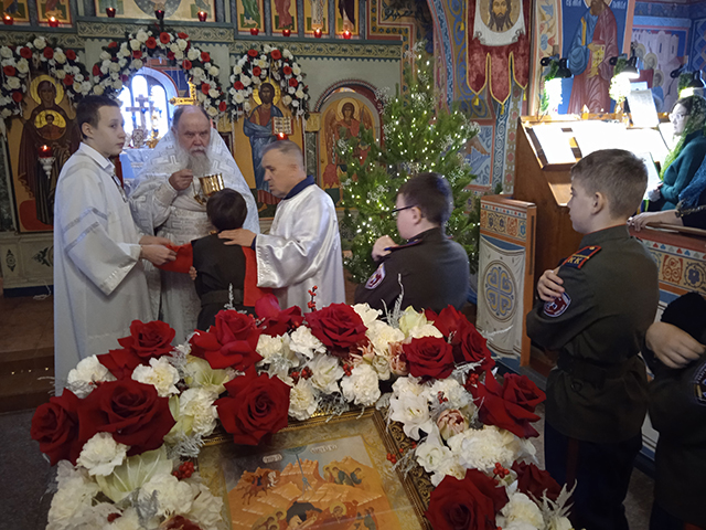А 8 января в Иверском храме по благословению Владыки Илариона кадетам после праздничной Литургии вручили сладкие подарки.