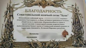 За регулярную гуманитарную помощь подразделениям, несущим службу на передовой, казаки «Крымского цеха» Севастопольской казачьей сотни «Буян» получили Благодарность. Изделия «Крымского цеха» разрабатываются и изготавливаются руками мастеров, выпускаются с использованием современных технологий, включая 3D-печать. Мастерская активно сотрудничает с различными фронтовыми подразделениями, обеспечивая работу бойцов надежными изделиями.
