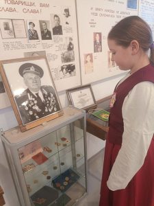 Экспонаты музея рассказывают о событиях Великой Отечественной войны, ветеранах войны — прадедах наших учащихся. Ребята познакомились с документами выпускников нашей школы — участников боевых действиях в Афганистане, героев Специальной военной операции.