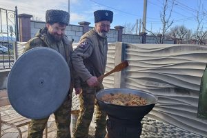 Походный Атаман А. Гобозов и Первый товарищ Атамана А. Макаров, не без помощи других казаков хутора, приготовили традиционные блюда казачьей кухни и от души накормили всех присутствующих на празднике.