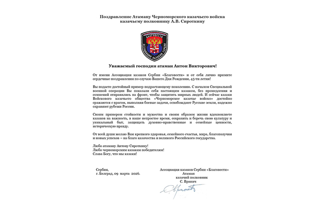 От имени Ассоциации казаков Сербии «Благовести» и от себя лично примите сердечные поздравления по случаю Вашего Дня Рождения, 45-ти летия!