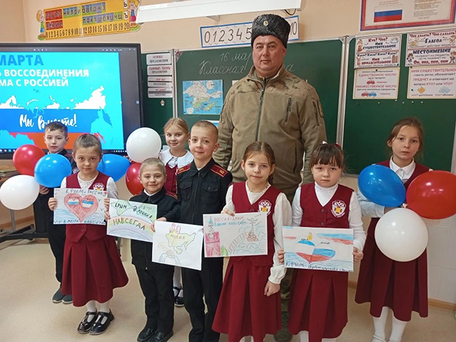 Рисовали рисунки, символизирующие радость и дружбу между Крымом и Россией. Провели классный час, на котором вспомнили о событиях 2014 года, референдум 16 марта и роль казаков-черноморцев в обеспечении безопасности Крыма в этот важный исторический период.