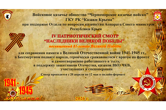 Во ознаменование 81-летия Великой Победы, для сохранения памяти о Великой Отечественной войне 1941-1945 гг., о Бессмертном подвиге народа, героически сражавшегося с врагом на фронте и самоотверженно работавшего в тылу, в поддержку защитников Отечества, казаков-черноморцев, участвующих в специальной военной операции, с 20 апреля в дистанционном формате проводится IV Открытый патриотический Смотр «Наследники Великой Победы».