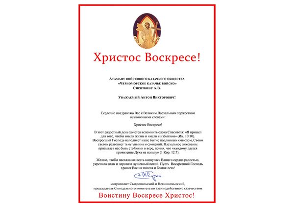 Атаман Севастопольского казачьего округа Александр Красюк поздравляет со Светлым Христовым Воскресением