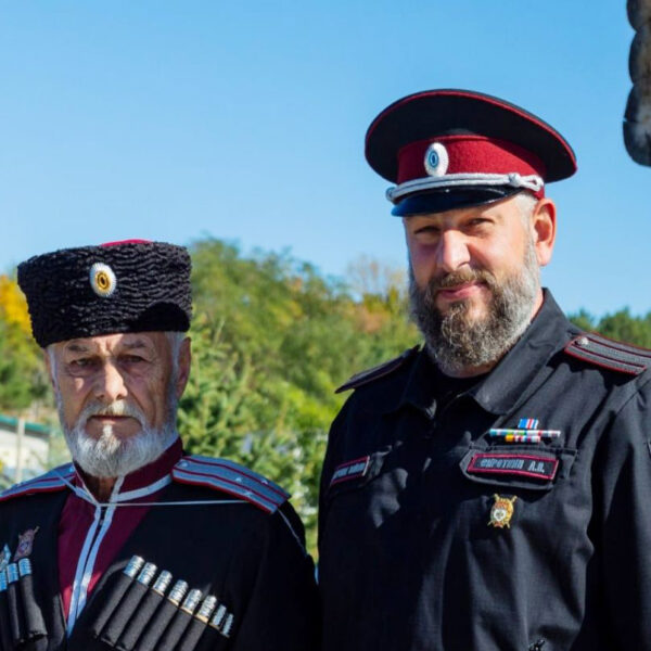 Атаман ЧКВ Антон Сироткин поздравляет Председателя Совета Стариков Крымского казачьего округа Анатолия Стрижака с Днём Рождения