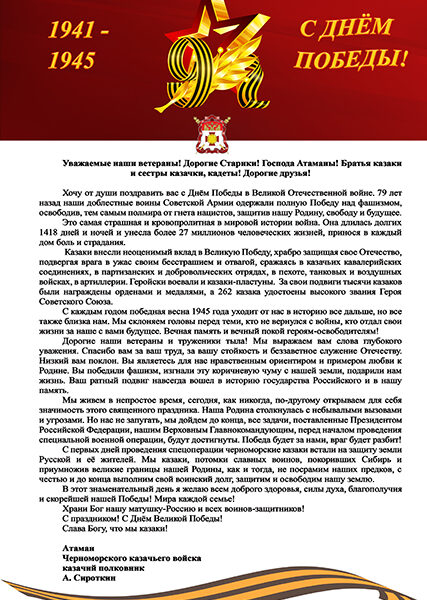 Уважаемые наши ветераны! Дорогие Старики! Господа Атаманы! Братья казаки и сестры казачки, кадеты! Дорогие друзья! Хочу от души поздравить вас с Днём ... Подробнее