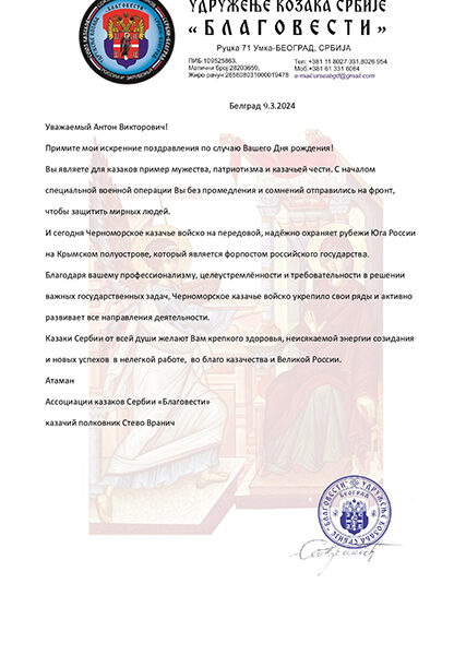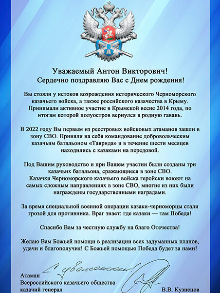 Представители Казачьей сотни КФУ им. Вернадского поздравляют с Днём Рождения Атамана войскового казачьего общества «Черноморское казачье войско» казачьего полковника Антона Викторовича Сироткина ... Подробнее