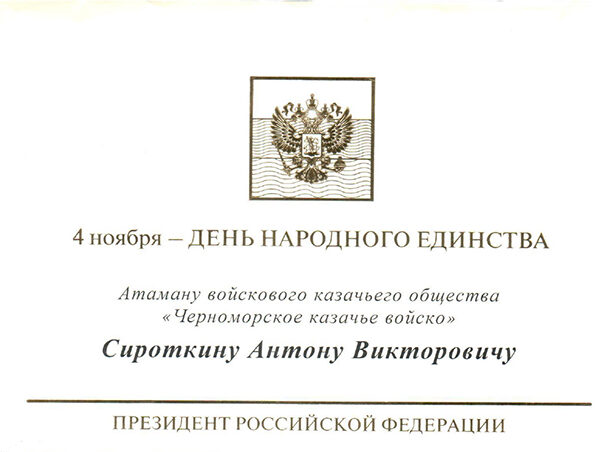 Поздравление от Атамана Черноморского казачьего войска Антона Сироткина с Днём Рождения начальнику отдела культуры Штаба ВКО ЧКВ Людмиле Николаевне Милюковой Уважаемая Людмила ... Подробнее